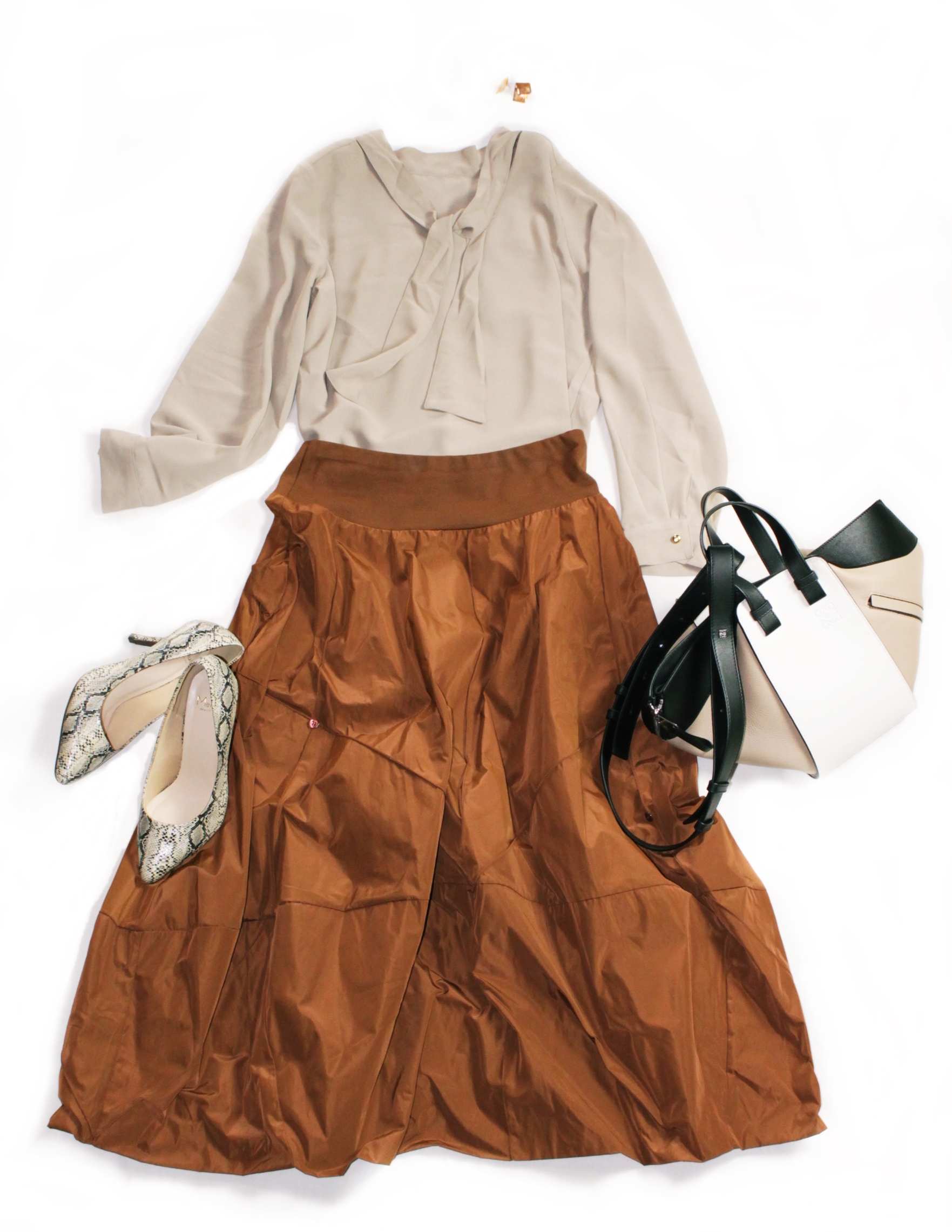 ダークカラーのないコーディネートの場合は、どこかで引き締めたい欲が発生するので、足元に柄物であるパイソンパンプスをもってきてスパイスを加えてみました。
