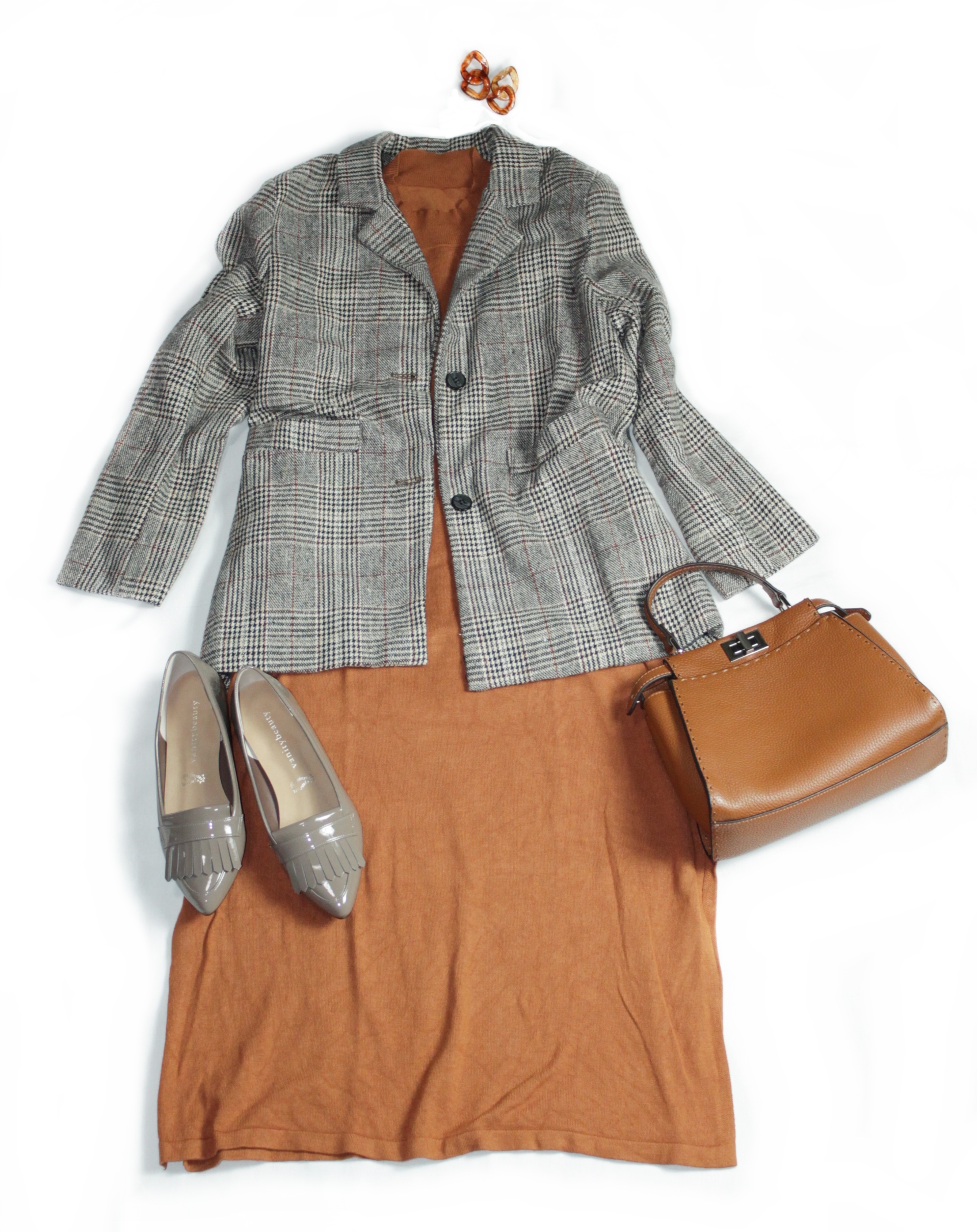 今日のポイントは、インナーに黒をあわせてボトムに明るめのトレンドカラーのスカート、クリアバッグ、ポイントトゥパンプスをあわせて、全体的におじジャケットのレトロ感を抑え気味にしてみた点です。