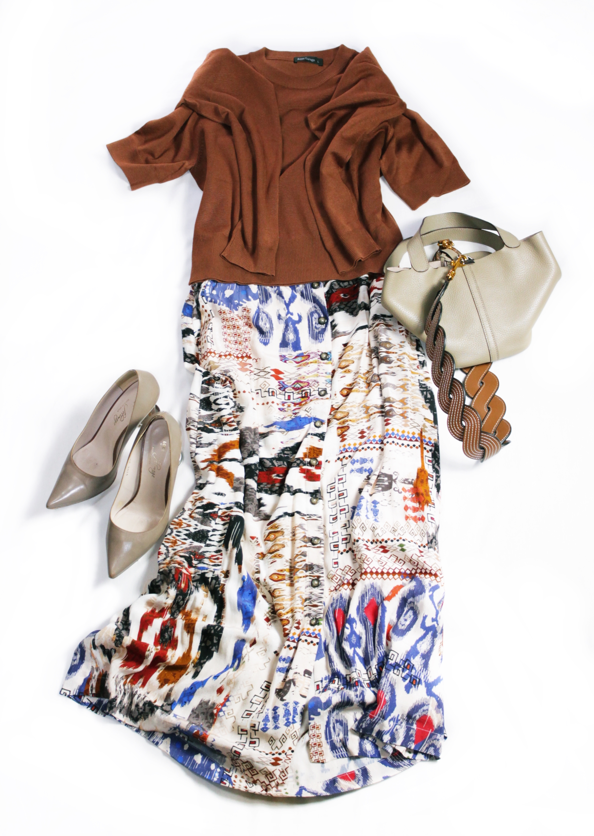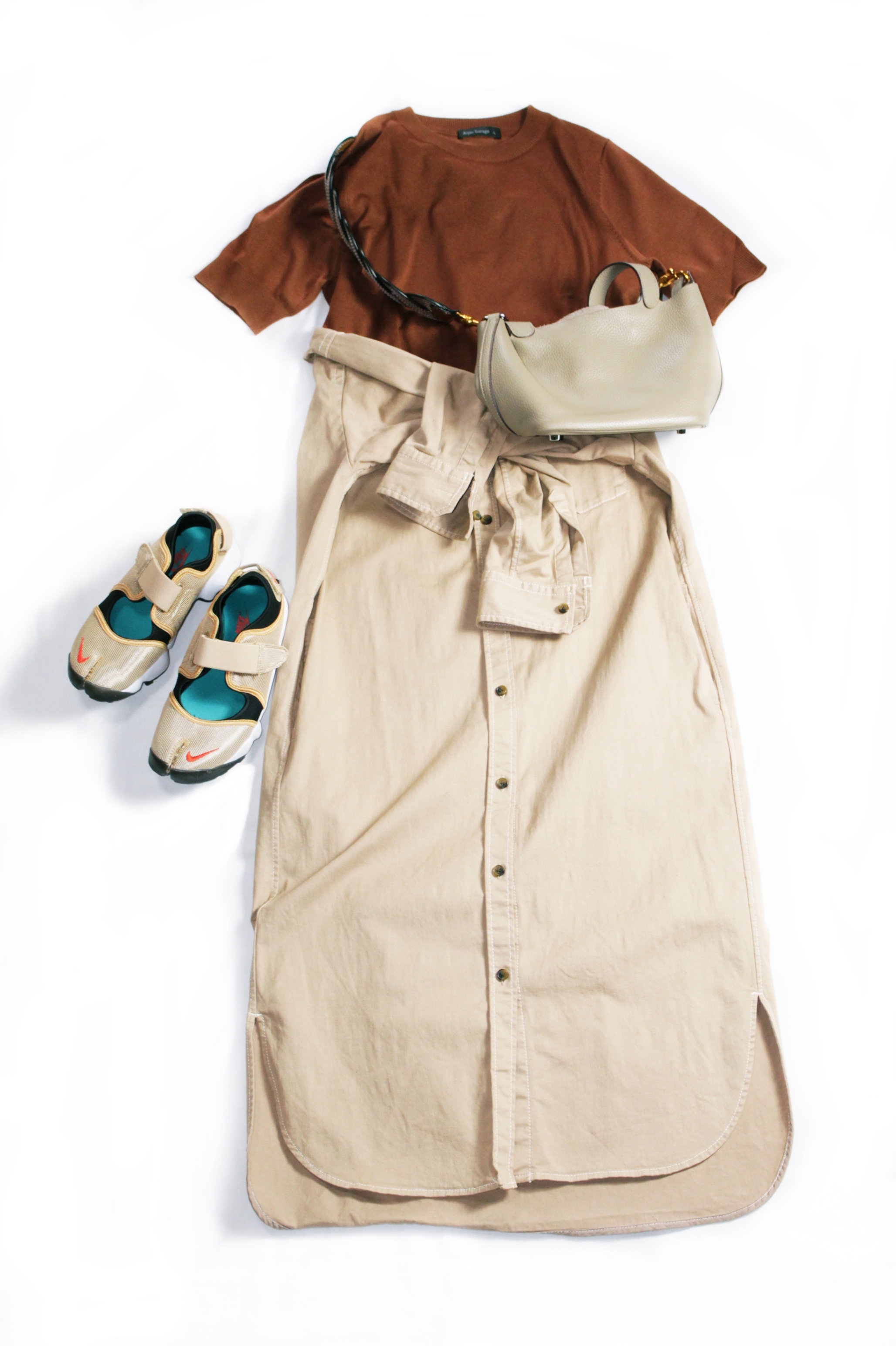 今回のコーデでは下に流行のブラウンキャメルのパンツを合わせつつ、ウエストの位置でシンプルなロープベルトを結んでみました。