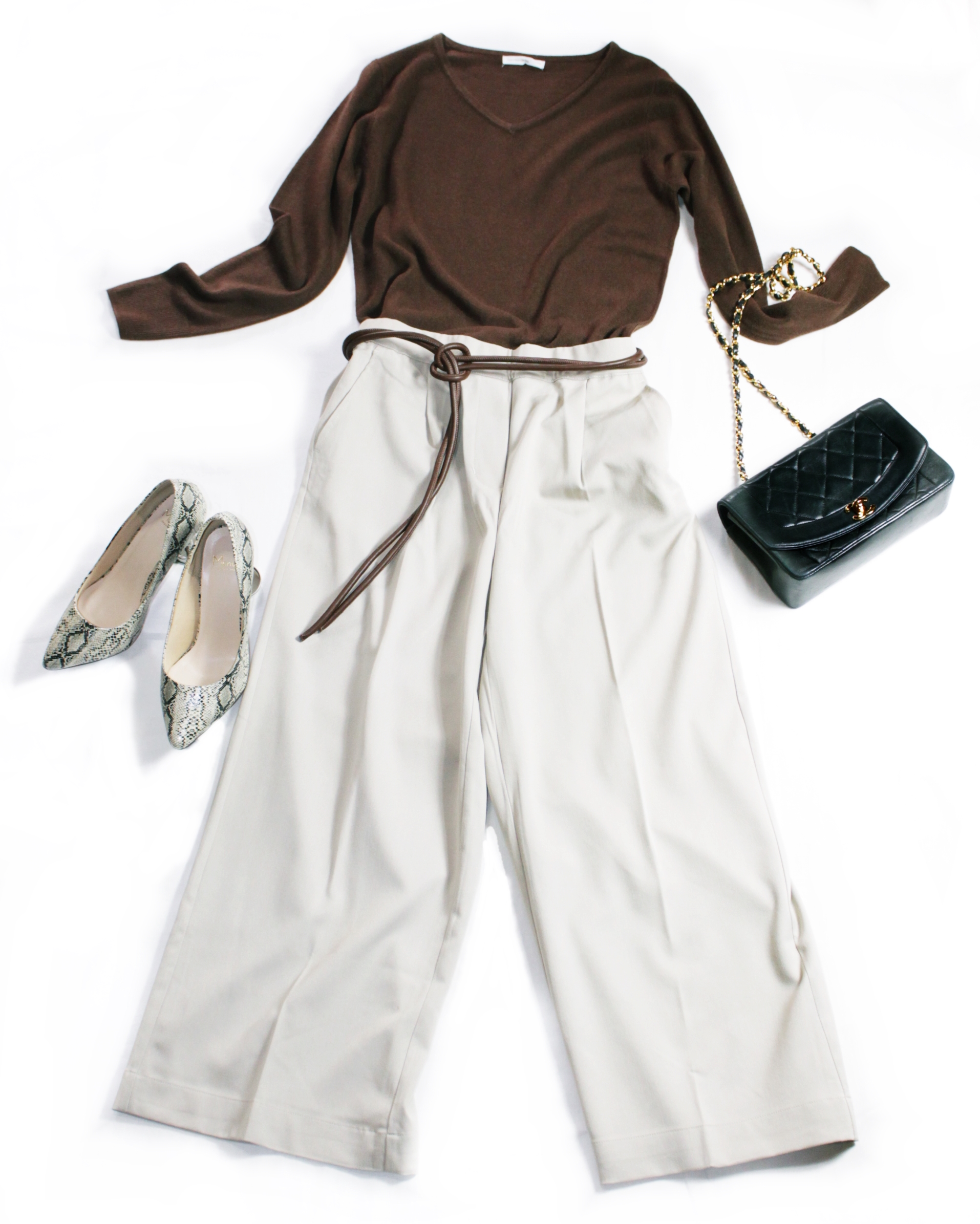 例えば、どうしても白ボトムにベージュのニットを合わせたい場合は、足元かバッグに色味の濃いものを合わせるとか。