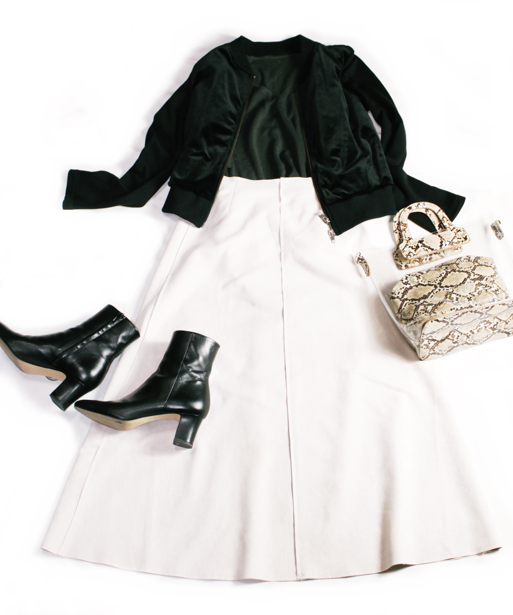 今回のコーデは白系なフェイクレザーベージュタイトスカートにブラウン系のとろみブラウス、黒ベロアのジャケット、茶バッグ、パイソンパンプスを合わせました。