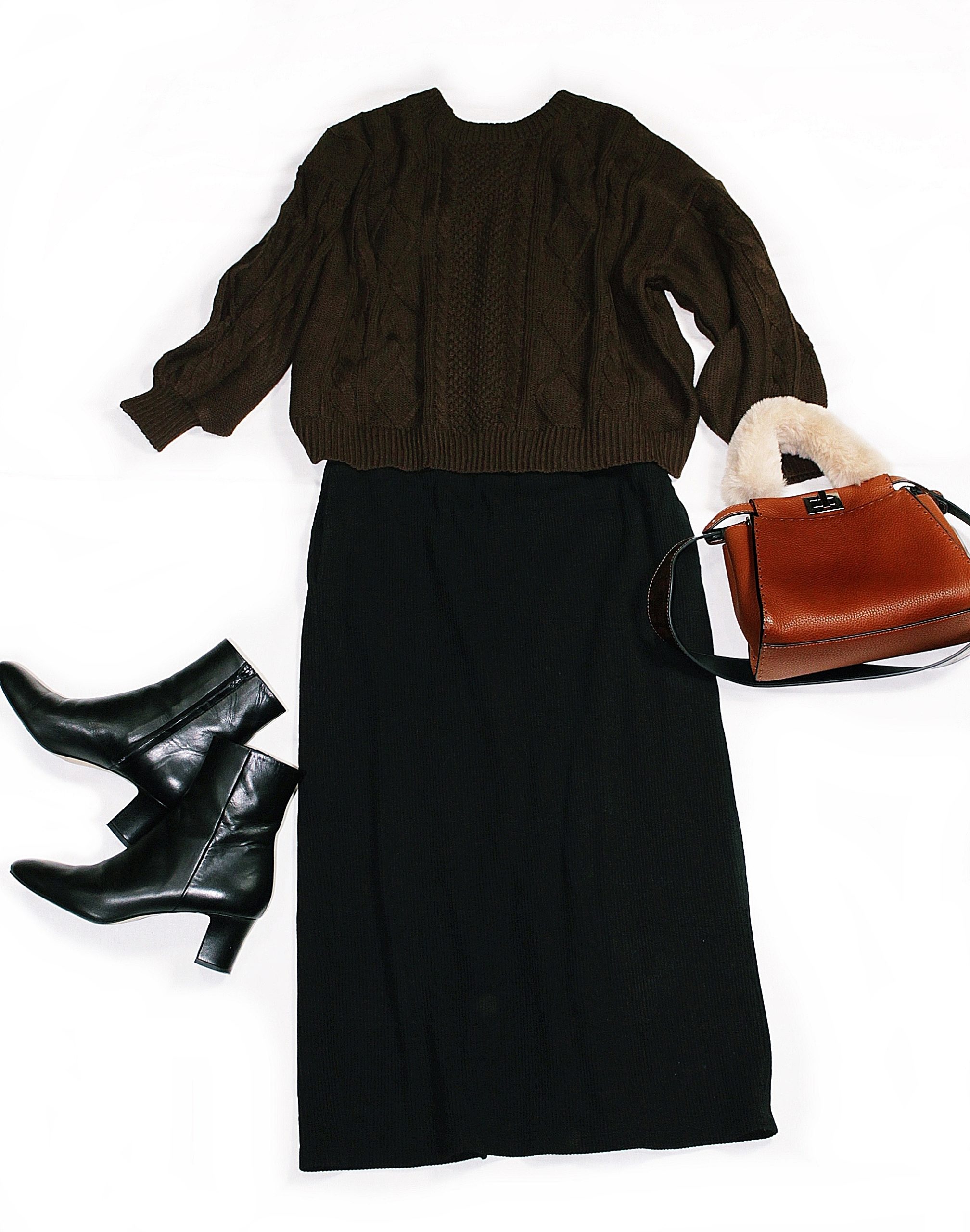 今回は一連のシリーズで着回しに使用しているPierrotのケーブルニットスカートにブラウンカーディガンを合わせてみました。